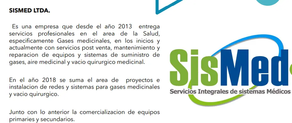 Es una empresa que desde el año 2013 entrega servicios profesionales en el area de la Salud, especificamente Gases medicinales, en los inicios y actualmente con servicios post venta, mantenimiento y reparacion de equipos y sistemas de suministro de gases, aire medicinal y vacio quirurgico medicinal.